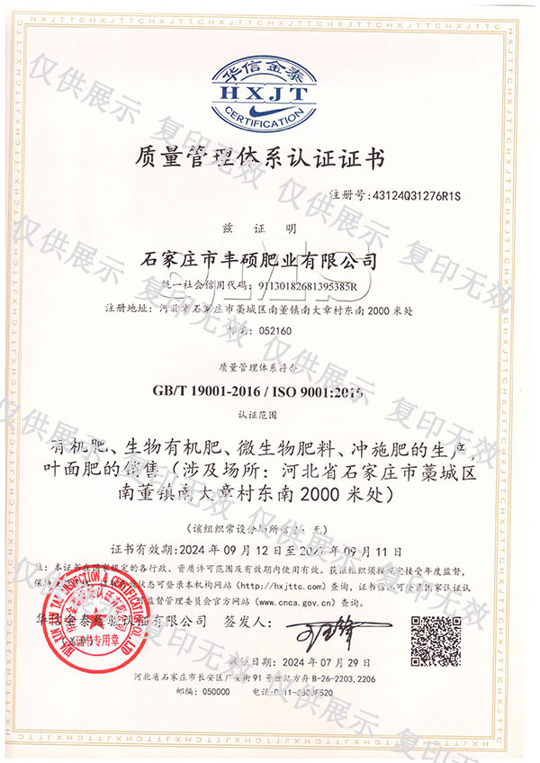 石家莊市豐碩肥業有限公司是一家集新型肥料的研發、制造、營銷、服務于一體的高新技術企業,公司自2008年創辦以來,一直致力于新型肥料的技術研發和市場推廣。公司組建了豐碩新型肥料研究中心(院士專家企業工作站),自主知識產權研發團隊專業科研人員20余人,獲得了多項肥料國家發明專利。公司目前已擁有發酵類有機肥、微生物菌劑、生物有機肥、土壤調理劑、大量元素水溶肥、含腐植酸肥料、含氨基酸肥料、中微量元素肥料等8大品類,“金維克”、“豐碩沃農”等2大自有品牌,擁有20多個暢銷品種。目前,我公司已經通過了“ISO9001 質量管理體系認證”、“ISO14001 環境管理體系認證”、“OHSAS18001 職業健康管理體系認證”。...